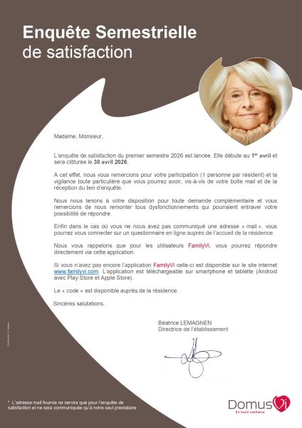 La campagne d'enquête de satisfaction à destination des résidents, familles et proches est désormais lancée. Elle se déroulera jusqu'au 30 avril inclus.