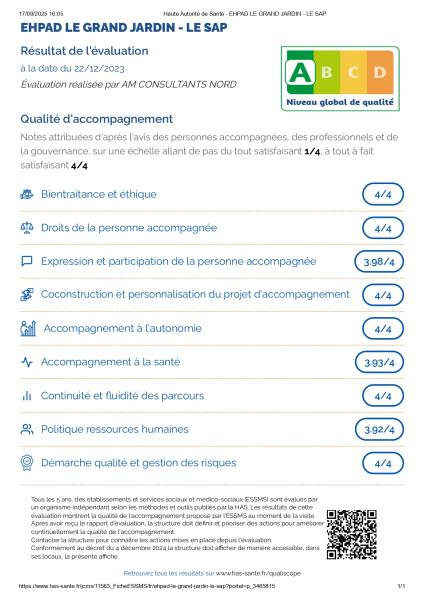 Suite à la réception cette semaine de la fiche synthétique, nous sommes heureux de vous annoncer que les résultats obtenus sont très positifs avec un Niveau Global de Qualité noté « A », le meilleur score possible, et viennent confirmer la qualité du travail accompli au quotidien par l’ensemble des équipes. Ce résultat est une reconnaissance précieuse du professionnalisme et de l’engagement de chacun, et nous souhaitons le partager avec vous, car vous êtes pleinement partie prenante de la vie de la résidence. Cette affiche est désormais disponible sur le site de la Haute Autorité de Santé. Vous la trouverez également affichée à l’accueil de la résidence.